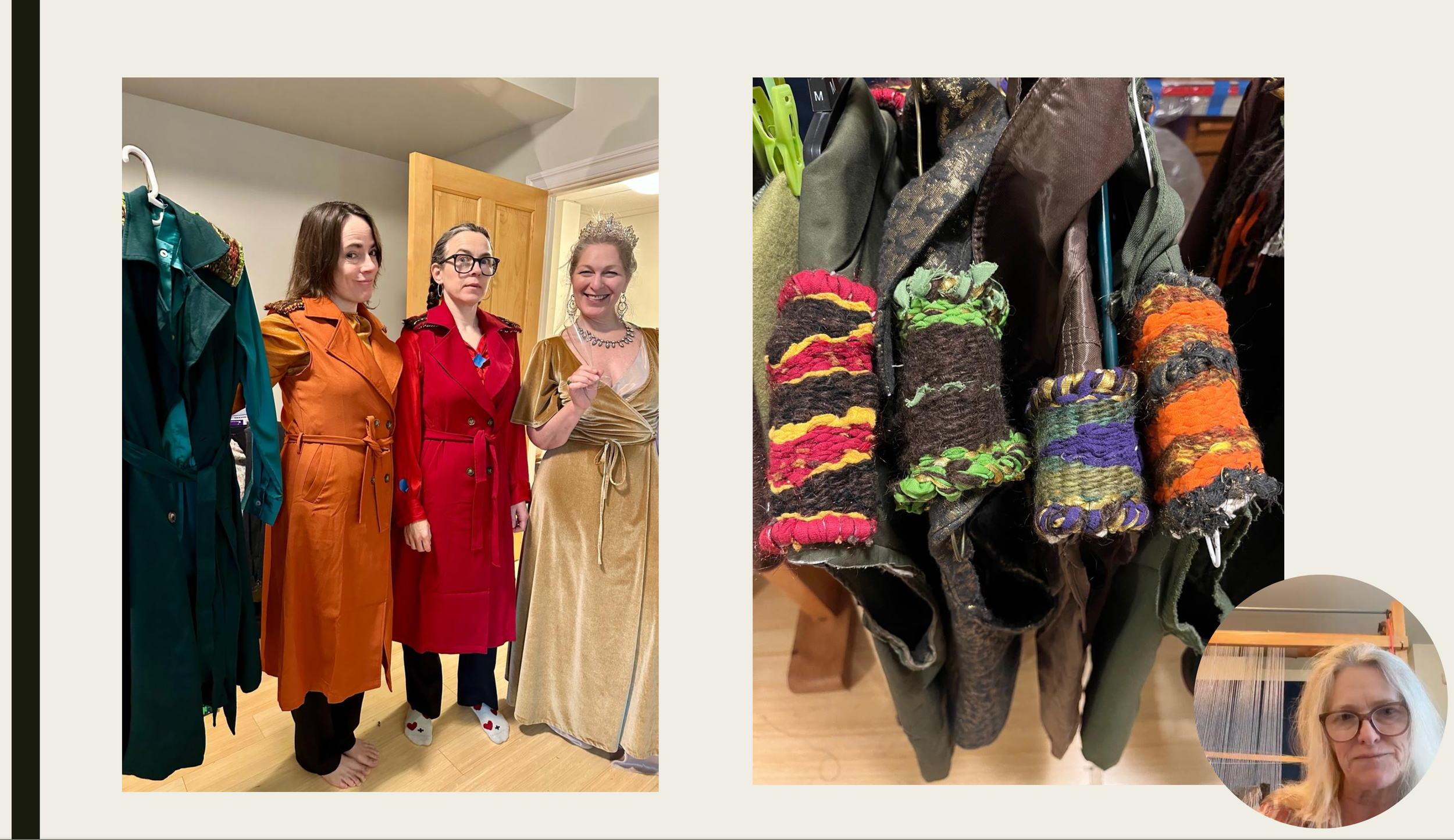 I met with Kate Bennis and learned about her goal of playing Queen Lear. Thirty years ago, I saw a production of King Lear at the New Vic in London. Kathryn Hunter played the role of King Lear. Her performance as the ill-fated King fascinated me. She was brilliant as a decrepit old man losing his mind, but I always wondered why she never played Lear as a woman. I was immediately fascinated that we would finally see an aging woman embody Shakespeare’s Lear. I shared my idea of weaving costume elements from recycled clothing. We discussed how clothes hold memories, represent identity, and symbolize ambition. What if woven costume elements were made from the character’s old clothes?