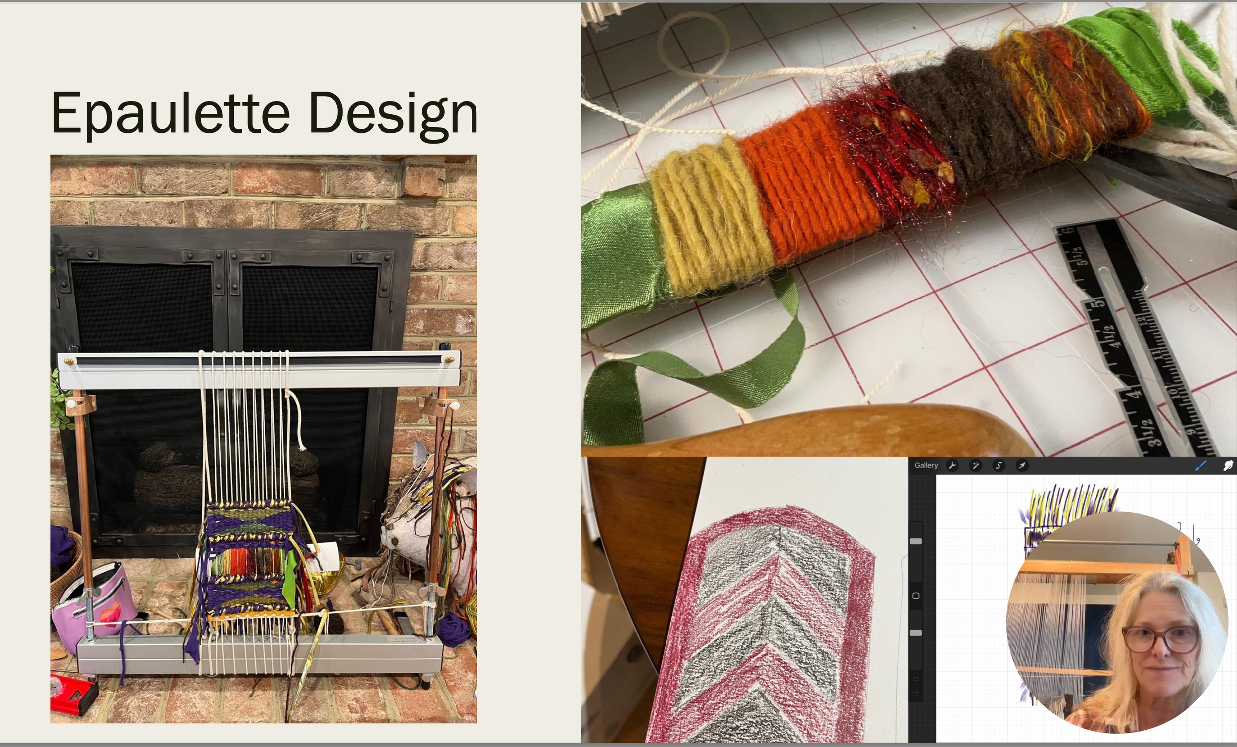 I designed costumes, purchased pre-owned clothing with the characters in mind, and began weaving. The result is a several sets of woven epaulets and emblems. The colors and materials symbolize the ambitions and relationships of the characters. The palette is autumn leaves, a time of year that is bittersweet for the resplendent harvest and the coming gloomy winter. Red and orange for Regan and Goneril. Green for Cordelia. Gold and Purple for Queen Lear. You also see a lot of brown yarn which comes from my flock of sheep. It’s my goal to reference the characters’ relationship to the land with this natural brown yarn.